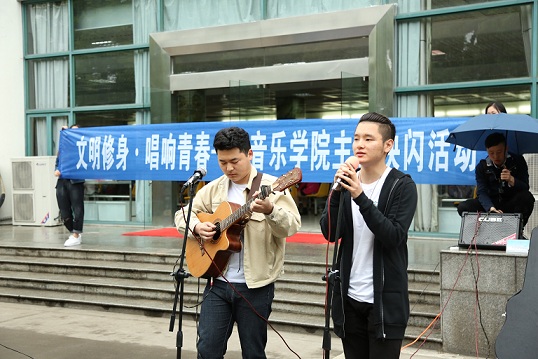快闪由三个环节组成,在徐子迪、高策两位同学的演奏《I'm yours》的优美声音中,两人在场中出现,一伴一唱,吸引过往人群的目光。紧接着《青花瓷》节目上演,由陈兴莲、朱丹君、吴星、刘怡、刘书君等五位同学器乐演奏,让大家感受到古典器乐的温婉魅力。最后20名同学们从周围出现,合唱曲目《当》把快闪活动推向高潮。