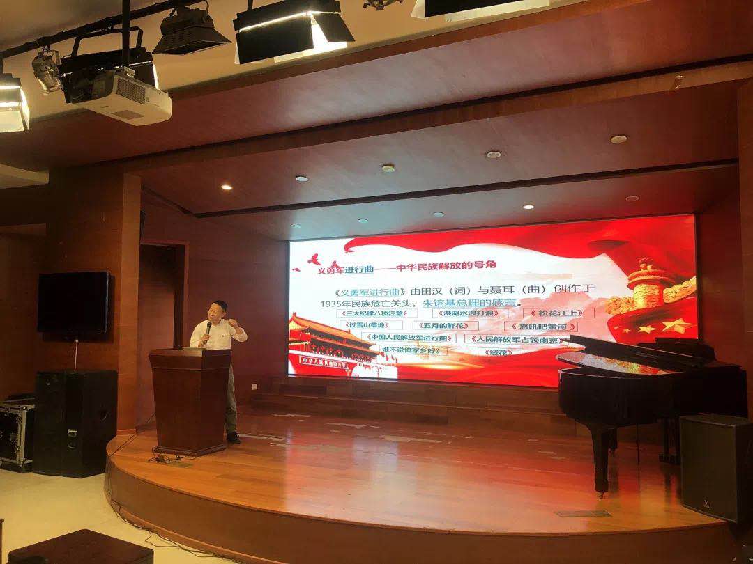 第一环节,党支部书记沈浩杰以红色经典歌曲的视频作导入,生动介绍了《国际歌》、《三大纪律八项注意》、《 松花江上》、《过雪山草地》、《五月的鲜花》、 《怒吼吧黄河》、《中国人民解放军进行曲》、《人民解放军占领南京》《绒花》等歌曲创作的历史背景、深刻意义以及艺术价值,着重挖掘展示了这些歌曲的红色基因、初心意义。