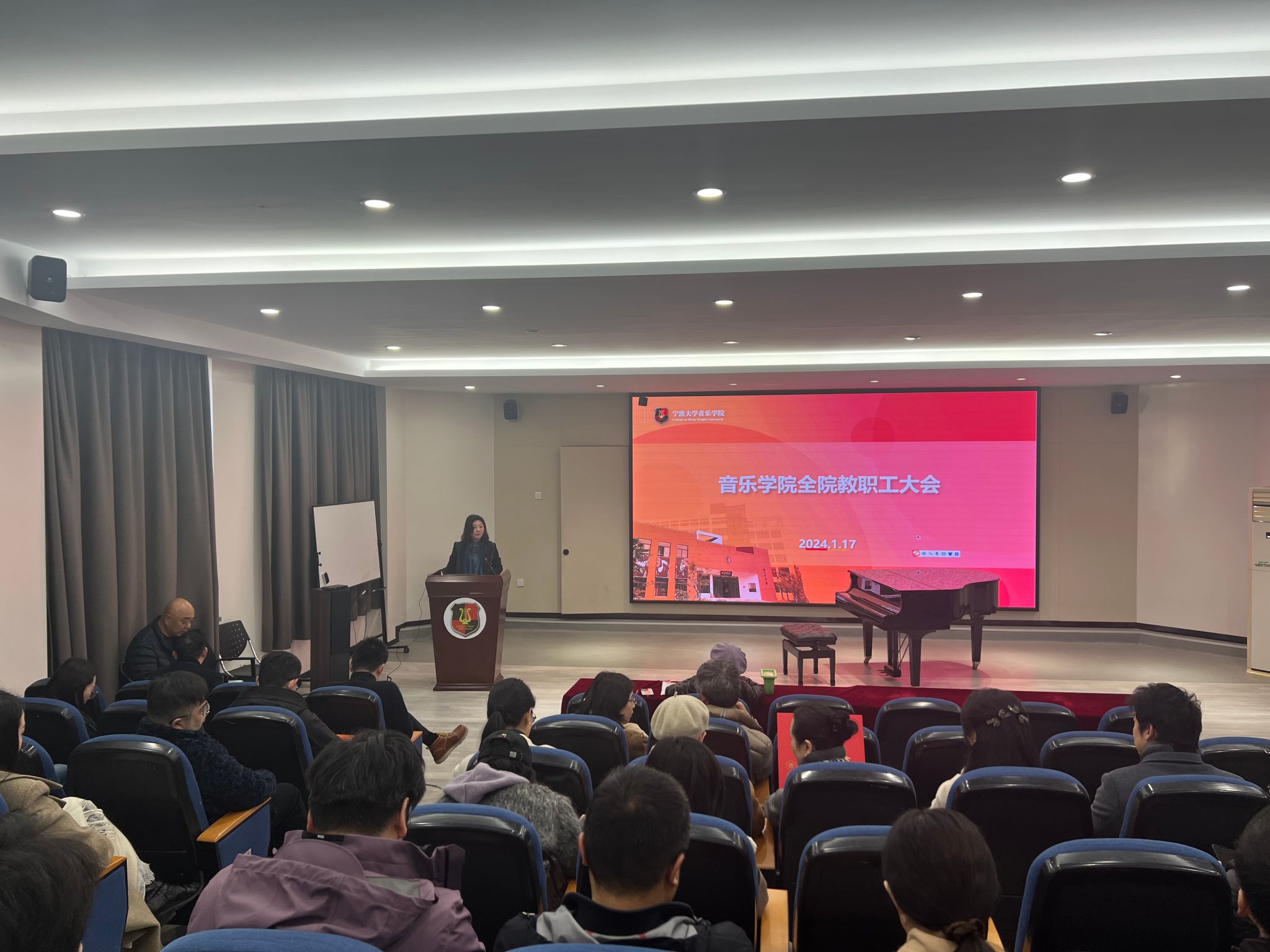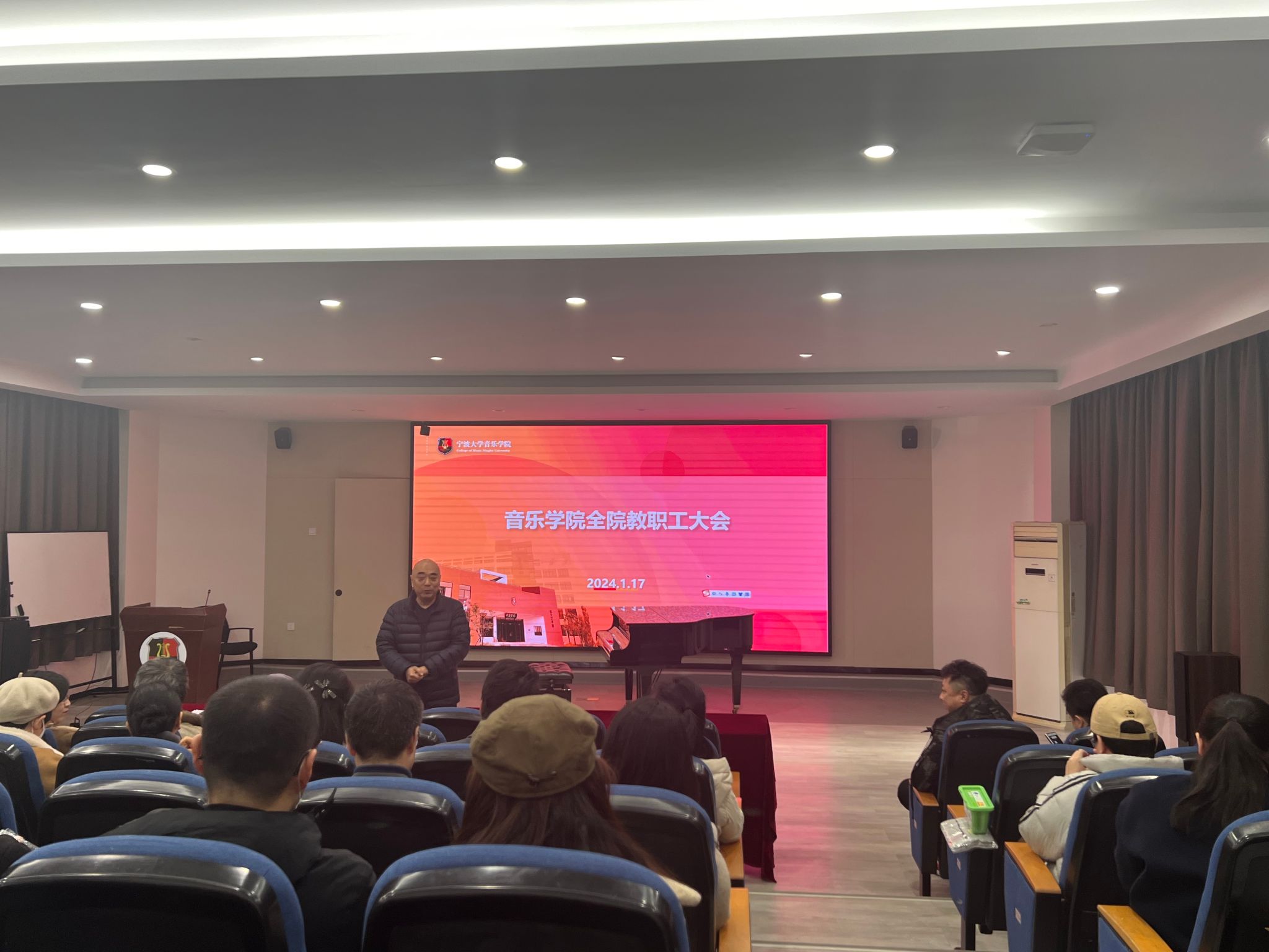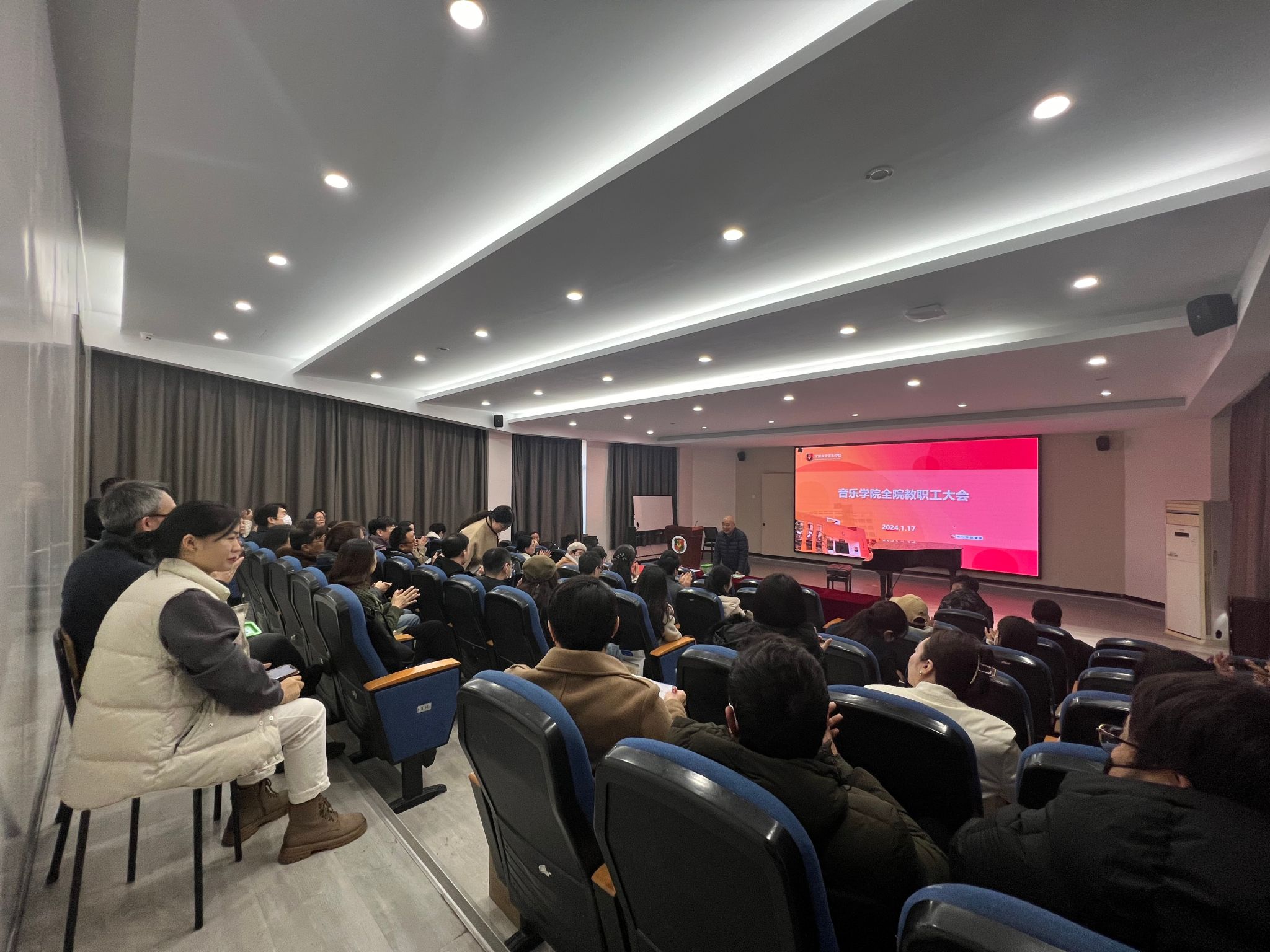全院大会在音乐楼101会议室召开。全院教职工参会,特聘院长俞子正主持。