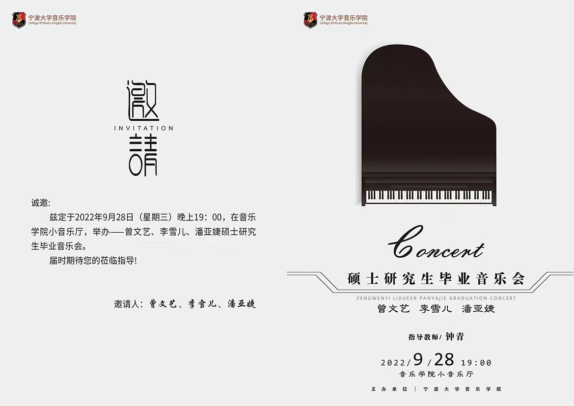 拉斯维加斯城网 20级音乐与舞蹈学专业钢琴教学研究方向曾文艺、李雪儿将于2022年9月28日于西区小音乐厅举行专场音乐会,欢迎大家前来聆听!