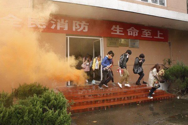立即启动应急疏散预案,参加演练的大一新生在疏导员的指引下,用湿毛巾捂住口鼻弯腰前行,有秩序地从楼梯往下撤离。经过紧急疏散,所有参演学生都撤离到了安全地带,演练画上了圆满的句号。