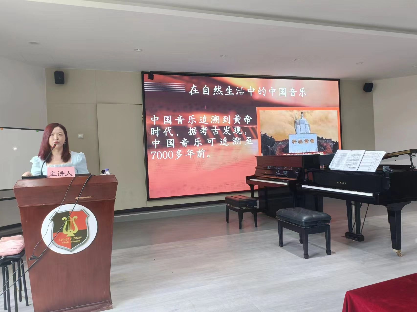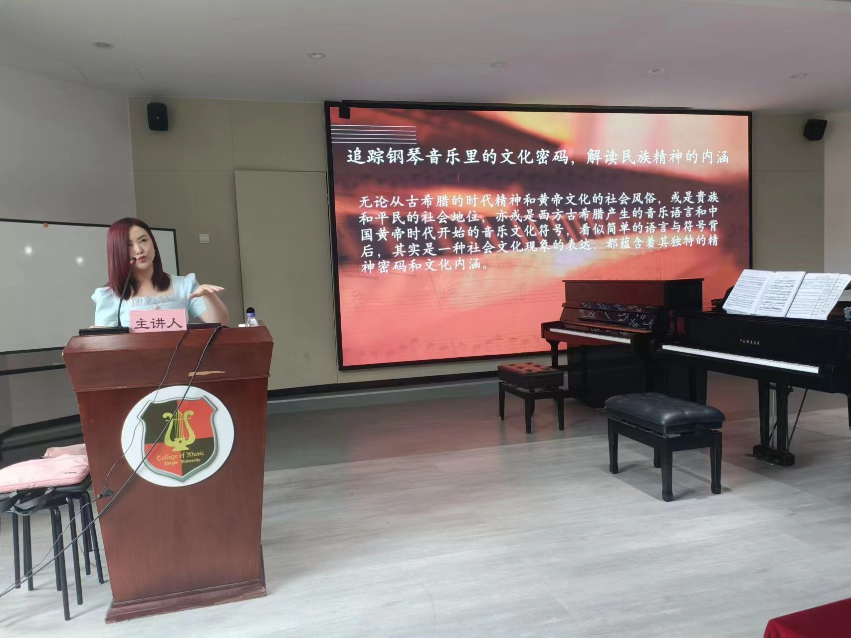 孟颖教授首先以“钢琴音乐里的文化密码”为主题,深入解读了钢琴音乐背后民族精神的内涵,探讨了音乐的深厚内涵与文化背景。她认为无论是从古希腊的时代精神和黄帝文化的社会风俗,或是贵族和平民的社会地位,亦或是西方古希腊产生的音乐语言和中国黄帝时代开始的音乐文化这些看似简单的语言与符号背后,其实都是一种社会文化现象的表达,都蕴含着其独特的精神密码和文化内涵。随后其向大家介绍了钢琴的演变与发展过程,又巧妙的结合了六朵花和六个国家展示了钢琴音乐在不同文化中的独特表现,使在场观众更加深刻地理解了音乐背后的文化内涵。