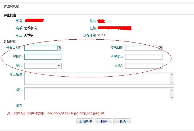 修改信息界面(划横线部分无法自己修改,有误请联系学工办王老师;对话框部分可自行修改或填补,带红色星号的对话框请务必按实将信息填写完整,其他对话框尽可能填写完整。籍贯生源地等为下拉菜单选择,在校通讯地址填写本人寝室地址,如西区公寓1号楼xxx。)