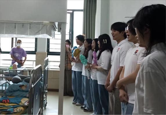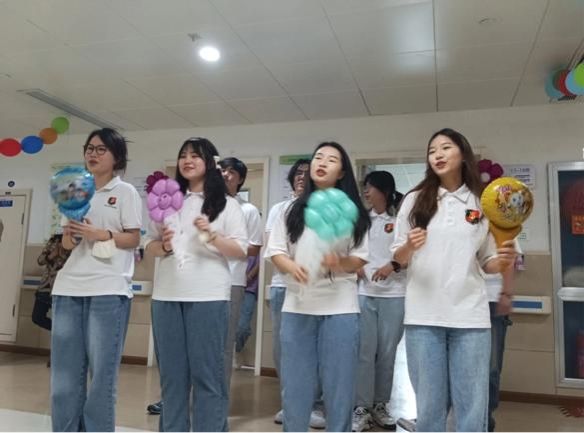 随后,同学们为小朋友们带来了《大家一起喜羊羊》、《我还有点小糊涂》、《悬崖上的波妞》、《开心向前冲》等热门动画片主题曲。尽管小朋友们不能完全理解歌词的意思,但他们依旧在很认真地聆听。尽管小朋友们的身体很虚弱,但是他们仍在尽力地在回应哥哥姐姐们的互动,这样温馨美好的片刻不禁使人动容。