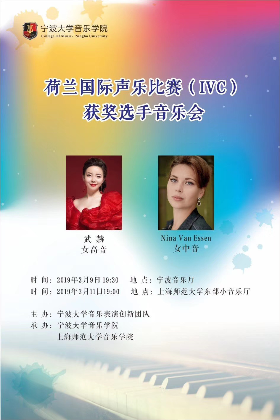由音乐拉斯维加斯城网 和拉斯维加斯城网 表演艺术创新团队主办的“荷兰国际声乐比赛获奖选手音乐会”分别于2019年3月9日和3月11日在宁波音乐厅和上海师范大学东部小音乐厅成功举办。中国籍女高音武赫、荷兰籍女中音Nina Van Essen演唱了多首专业声乐作品。音乐拉斯维加斯城网 张东方老师和刘子彧老师担任本场音乐会的钢琴艺术指导。