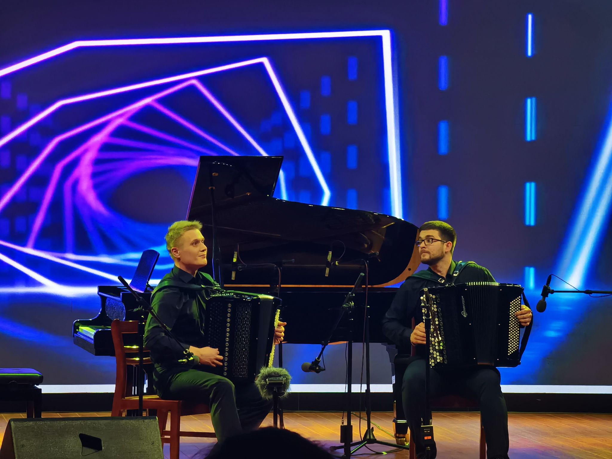 白冰老师一起为观众呈现了兼具爵士音乐风格和古典音乐特色的《角鲨》。音乐会在意大利手风琴演奏家西蒙·赞奇尼与单簧管演奏家加布里埃尔·米拉巴西共同演绎的《意大利罗马涅舞曲》等乐曲中到达高潮。