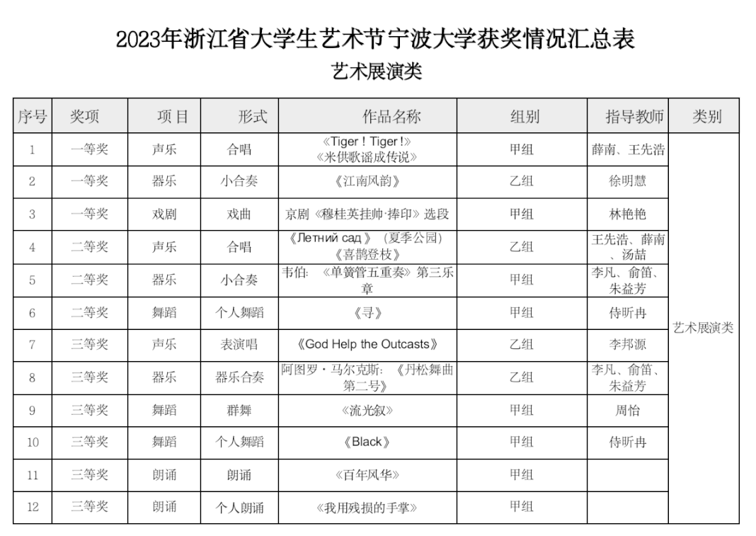 教师薛南老师、王先浩老师指导的合唱《Tiger! Tiger! 》及《米供歌谣成传说》、徐明慧老师指导的小合奏《江南风韵》、林艳艳老师指导的京剧《穆桂英挂帅·捧印》选段等3项作品入围现场展演环节,拉斯维加斯城网