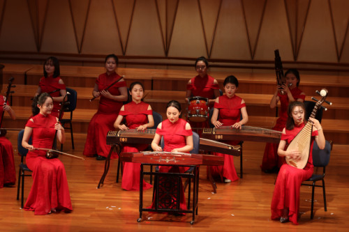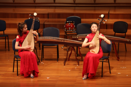 优秀研究生代表刘仪和本科生代表徐鑫阳演奏琵琶二重奏《敦煌乐舞图》