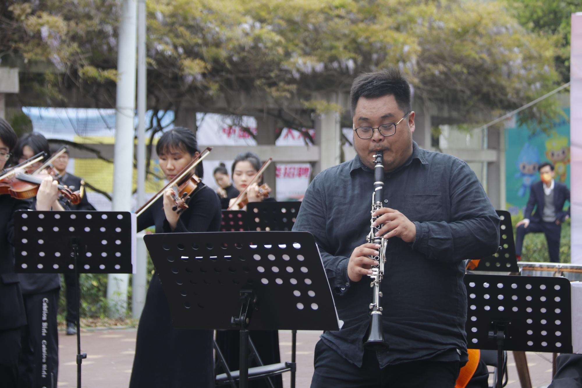 课程在《卡门》两首组曲中拉开帷幕,激昂的旋律将师生迅速带进音乐氛围中。期间,主讲人兼指挥李凡老师分别向观众们介绍了弦乐组、管乐组与打击乐组的乐器种类和表演曲目。从《梁祝》、《化蝶》等耳熟能详的小提琴、大提琴合奏曲目,到狮子王主题曲,交响乐团弦乐组的演出或宛转悠扬,或气势恢宏。长笛单簧管钢琴合奏《帕凡舞曲》,动静结合,营造出神秘的氛围和色彩,把听众们一下子拉入了中世纪的宫廷之中。随后,《太阳照常升起》、《dance monkey》两首萨克斯重奏接连上演。本次交响乐团专场还加入了特别的节目——杨振宇老师和他的电子乐队带来的了原创歌曲 《我》。这首原创歌曲赢得了现场阵阵掌声。演出最后,为庆祝北京冬奥会的圆满落幕,同时迎接即将到来的亚运会盛会,李凡老师带领学生交响乐团的同学们一同演奏了《奥林匹克号角》。乐曲激昂高亢、气势恢弘,极具感染性,疫情当前,也让在场的师生们汲取艺术的力量,和衷共济、携手并进。