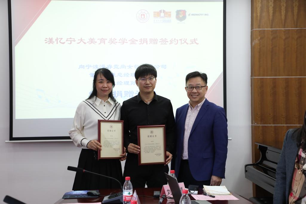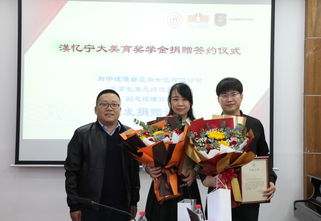 学生美学素养的提升,带动宁波所有大学生乃至宁波市民的人文审美与艺术情操的提高,为长远打造宁波时尚之都做出贡献。宁波漫睿霓尚女包有限公司董事长兼总经理张国君、美育教育中心主任俞子正代表双方签署捐赠协议。